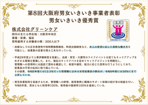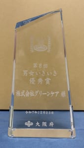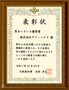 このたび株式会社グリーンケアは、大阪府が推進する「男女いきいき・元気宣言」事業において、『優秀賞』を受賞いたしました。
