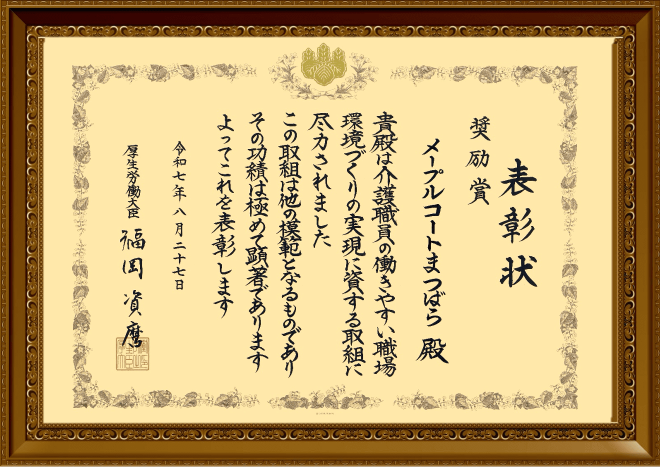 このたび、弊社が運営する 「住宅型有料老人ホーム メープルコートまつばら」 が、大阪府の推薦を受け、『令和7年度 介護職員の働きやすい職場環境づくり 内閣総理大臣表彰・厚生労働大臣表彰』において「厚生労働大臣表彰 奨励賞」を受賞いたしました。