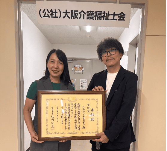 また、当社が賛助会員として所属している「公益社団法人 大阪介護福祉士会」を訪問し、淺野幸子会長へ受賞のご報告を行いました。面会の中では、日頃より取り組んでいる「介護職員のキャリア形成支援」や「職場環境の改善」について意見交換を行い、淺野会長からは、「現場の声をもとに職員一人ひとりの働きやすさを追求する姿勢こそが、業界全体を前進させる力になる」との心温まるお言葉を頂戴いたしました。