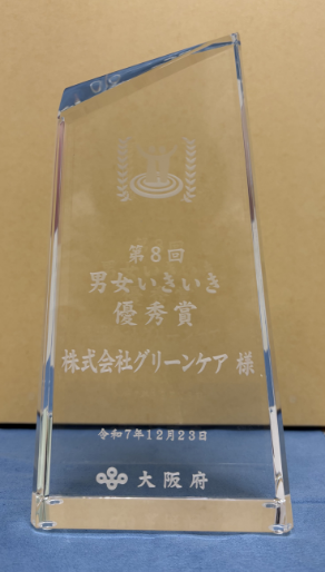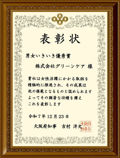株式会社グリーンケアは、大阪府が推進する「男女いきいき・元気宣言」および「プラス事業者認定」を令和7年8月8日付で取得し、これを契機に、当社ではさらなる取り組みの充実と社会的評価の向上を目的として、大阪府「男女いきいき事業者表彰制度」に申請いたしました。